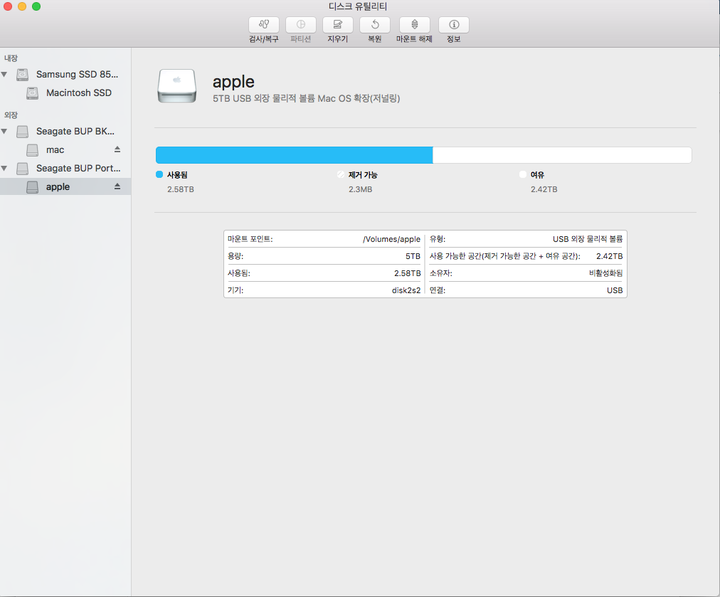 형님들 5TB apple 외장하드에 있는 2.3MB 제거가능 영역 이거 어떻게 지우나요?? ㅜㅜㅜ